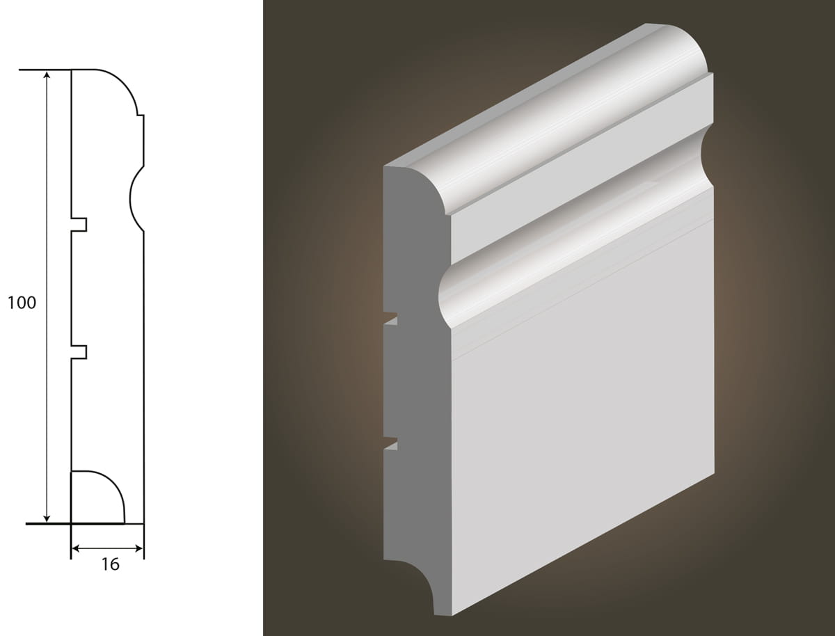 Do produkcji listew przypodłogowych stosowane są płyty MDF - płyta drewnopochodna średniej gęstości, stanowiąca podstawowy materiał produkcji mebli. Powierzchnia lakierowana lakierami poliuretanowymi, dolna krawędź izolowana przeciwwilgociowo.