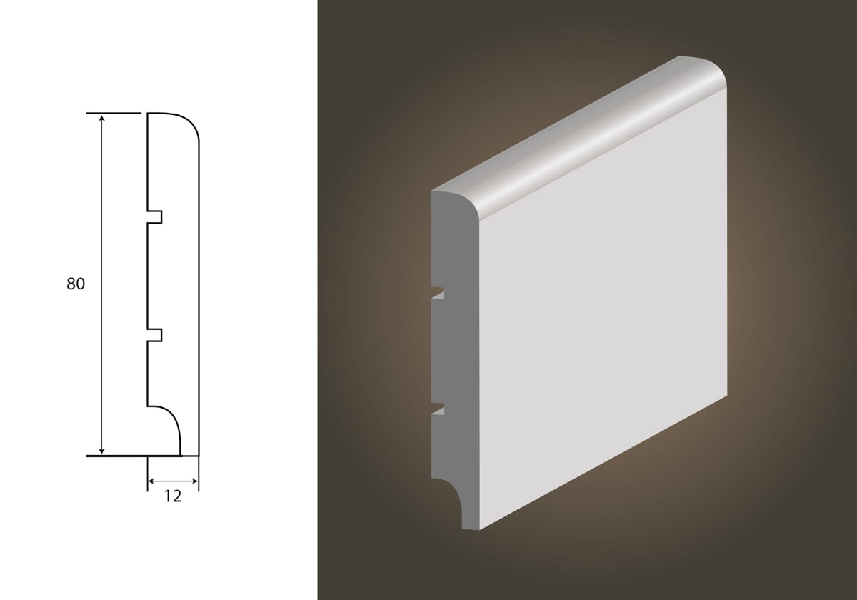 Do produkcji listew przypodłogowych stosowane są płyty MDF - płyta drewnopochodna średniej gęstości, stanowiąca podstawowy materiał produkcji mebli. Powierzchnia lakierowana lakierami poliuretanowymi, dolna krawędź izolowana przeciwwilgociowo.