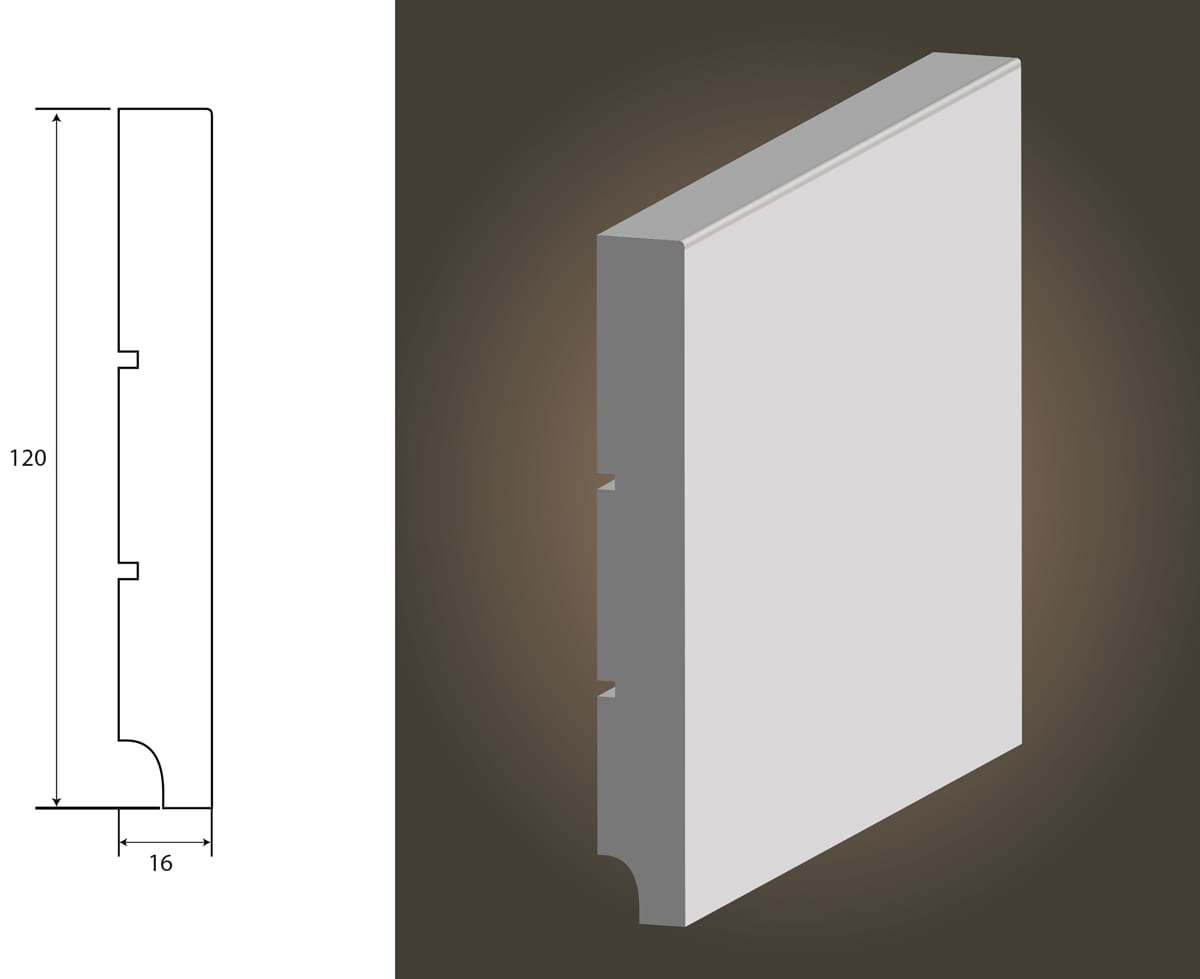 Do produkcji listew przypodłogowych stosowane są płyty MDF - płyta drewnopochodna średniej gęstości, stanowiąca podstawowy materiał produkcji mebli. Powierzchnia lakierowana lakierami poliuretanowymi, dolna krawędź izolowana przeciwwilgociowo.