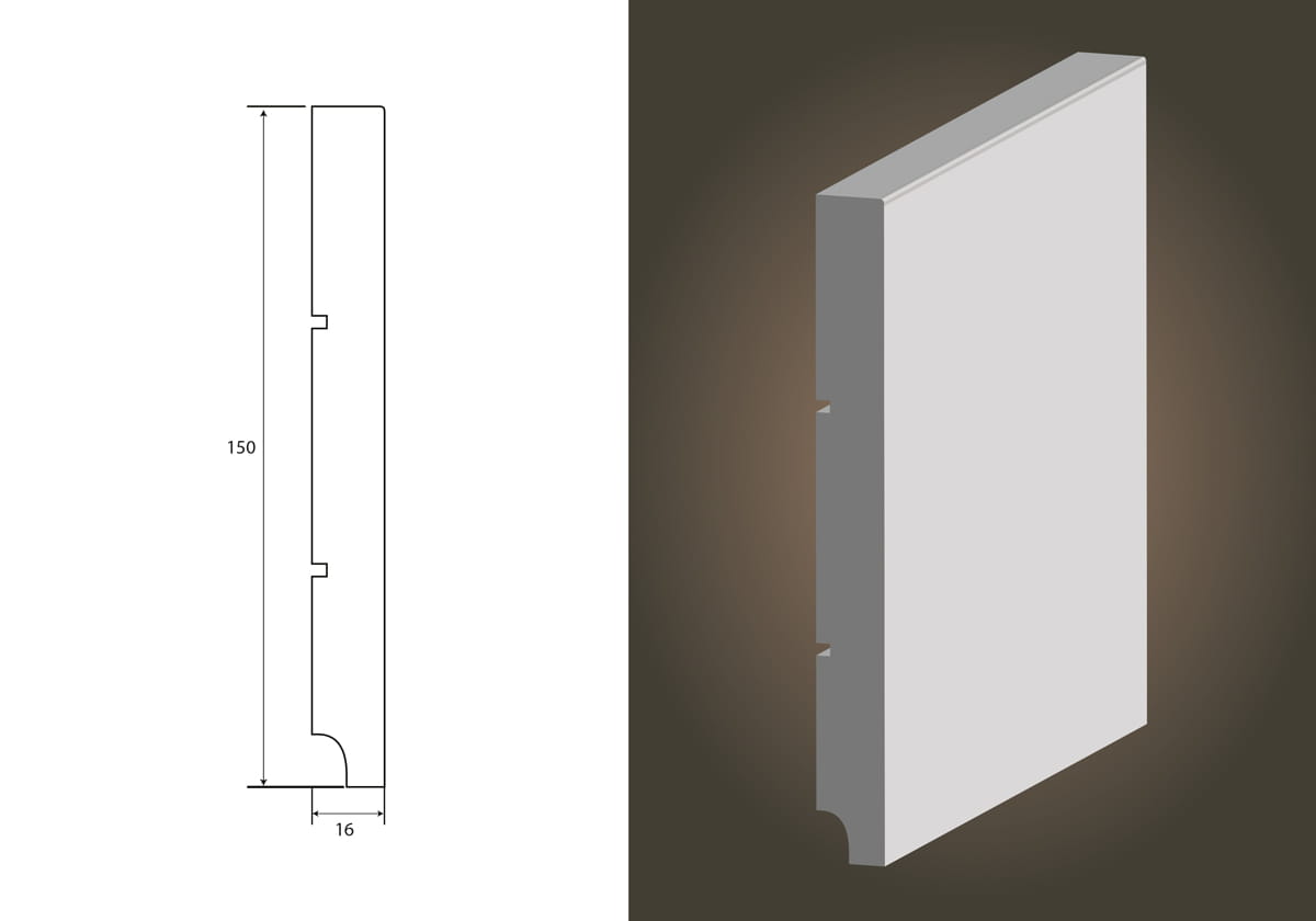 Do produkcji listew przypodłogowych stosowane są płyty MDF - płyta drewnopochodna średniej gęstości, stanowiąca podstawowy materiał produkcji mebli. Powierzchnia lakierowana lakierami poliuretanowymi, dolna krawędź izolowana przeciwwilgociowo.