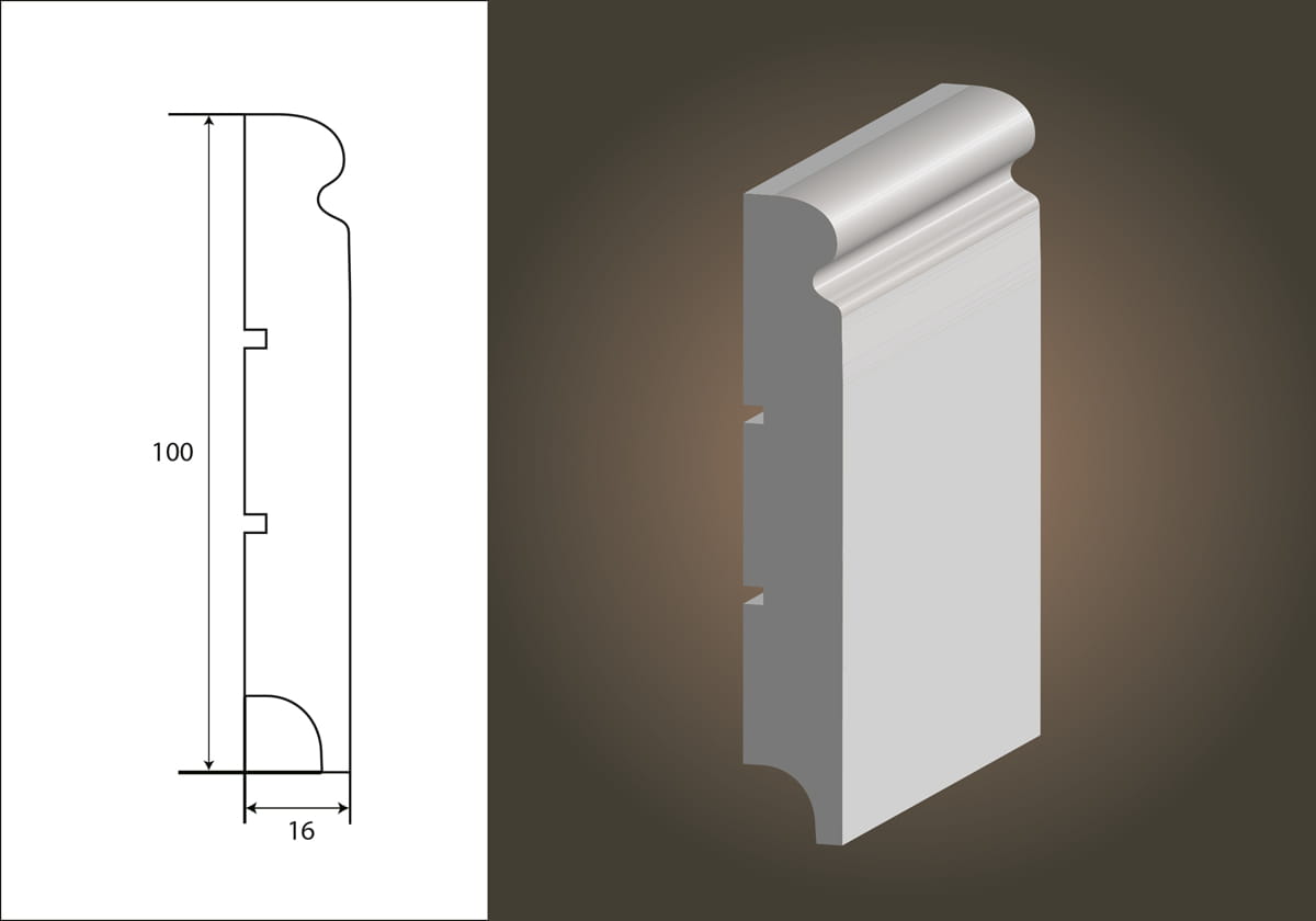 Do produkcji listew przypodłogowych stosowane są płyty MDF - płyta drewnopochodna średniej gęstości, stanowiąca podstawowy materiał produkcji mebli. Powierzchnia lakierowana lakierami poliuretanowymi, dolna krawędź izolowana przeciwwilgociowo.