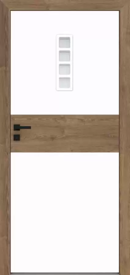 - Skrzydło wykonane w dekorze biała mat z możliwością wyboru dekoru pasa środkowego. Krawędź skrzydła w kolorze pasa